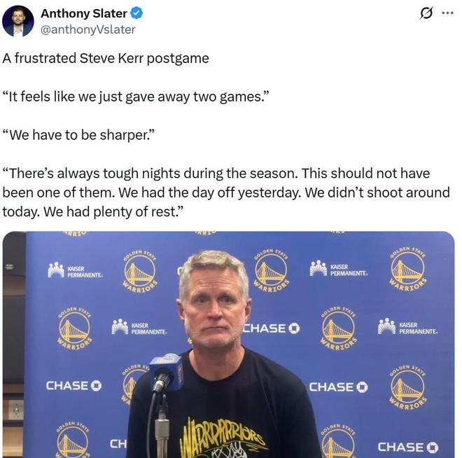 值得一提的是,在前一場(chǎng)勇士隊(duì)不敵殘陣雄鹿后,科爾就曾公開用諷刺的口吻批評(píng)球隊(duì),表示當(dāng)勇士隊(duì)面對(duì)缺少主力的球隊(duì)時(shí),戰(zhàn)績(jī)差不多是0勝12負(fù),以后對(duì)手面對(duì)勇士時(shí)都要輪休主力了。