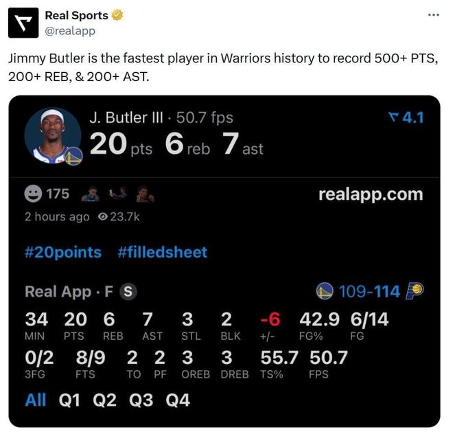 全場(chǎng)巴特勒高效砍下20分6板7助3斷2帽,加入勇士以來僅用37場(chǎng)就拿到688分204板210次助攻,成為勇士隊(duì)史達(dá)成500分200板200助攻最快的球員。